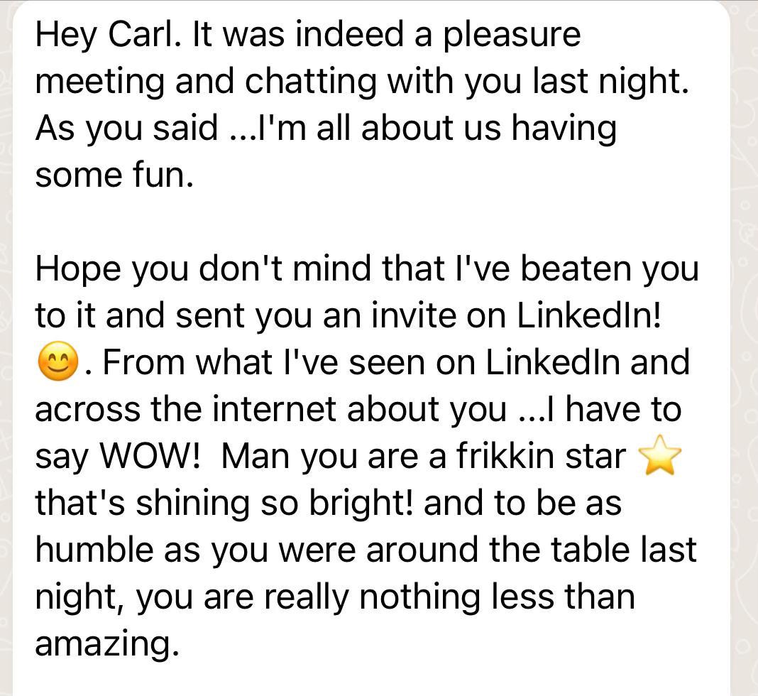 I’m probably going to do the least humble thing you could imagine and share an extract from a message that I received from a lovely guy called Ainsley, who I met at a dinner in Edinburgh after an event. We had a good chat as we were sat next to each other, we said the usual pleasantries, and found we both had a mutual excitement about helping the next generation and around innovation.